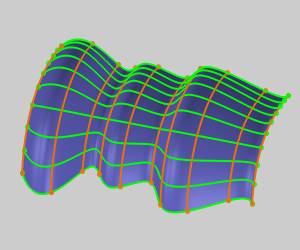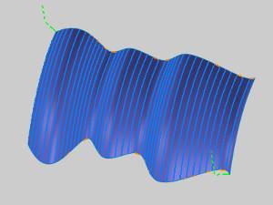 The Flowline toolpath uses the UV lines of the selected surface to determine the general toolpath direction. The following image shows the UV lines for the example part using green and orange. Notice the lines are perpendicular to each other.