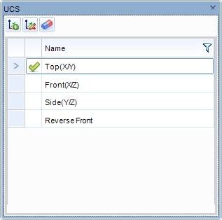 The UCS Manager is used to select between existing user coordinate systems, to modify existing user coordinate systems, and to create new user coordinate systems. The default user coordinate systems are, Top (X/Y), Front (X/Z), and Side (Y/Z). The default coordinate systems cannot be modified, but others can be created, and at any point in the drawing process, you can click on a particular UCS in the UCS Manager to make that the active coordinate system. When you set a UCS as active, the coordinate system in the graphics area is updated to reflect the selected UCS. CAD geometry is always created using the X,Y, and Z zeros of the Active UCS.