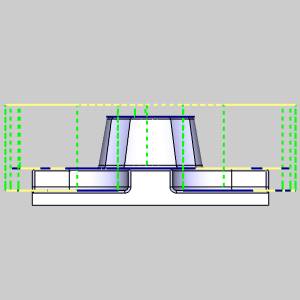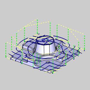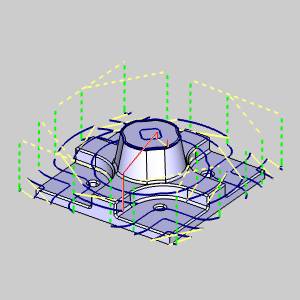 On our example part, we have used a solid model to set the stock to a specific shape.In this case, we have roughed out the stock with an Advanced Rough and have finished that up with a Flatlands toolpath.Itis the rapid heights of the Flatlands toolpath we intend to adjust.Takea moment to notice there is only two rapids, highlighted in red in the images below, that need to be at their current height.