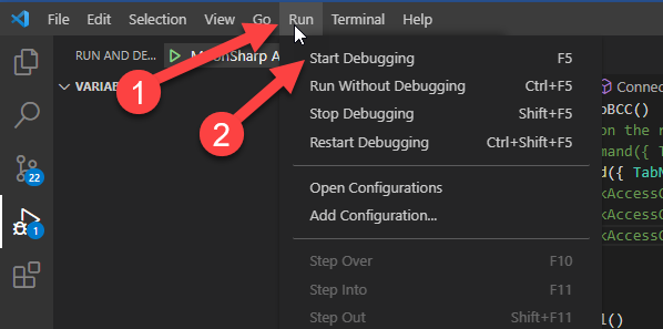 Before clicking OK, this is the point in time where you want to start the debugger in Visual Studio Code by choosing Run > Start Debugging as seen below:
