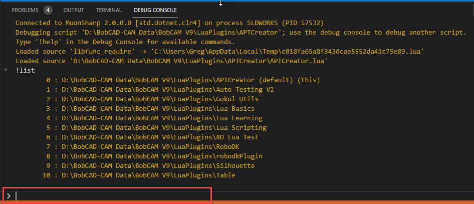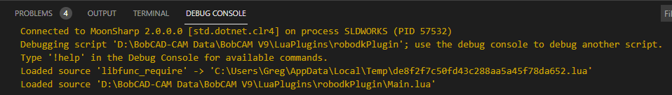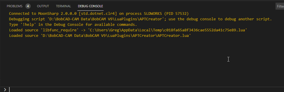 Line 1: What process is acting as the MoonSharp debug server. In the above example image I am utilizing the BobCAM for SolidWorks product inside Solidworks 2021 which is why you see the process is SLDWORKS.
