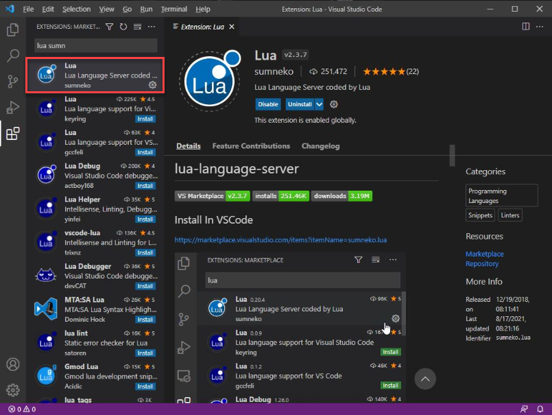 This step is not required by any means, but I have also found the Lua extension by sumneko to be very useful as it offers great functionality for working with Lua files in Visual Studio Code. I just figured while we were installing extensions, you might as well know about this one too!