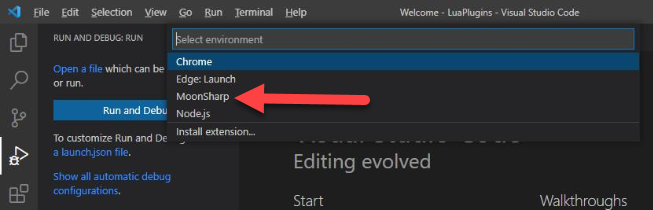 After clicking the create a launch.json file, Visual Studio Code may prompt you to select an environment. Choose the MoonSharp environment if this screen is presented: