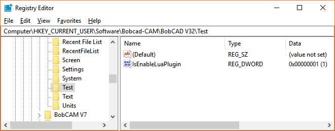 In order to enable the Lua Plug-in capabilities in BobCAD-CAM, a registry key must be added to the system. We have chosen to not enable this by default, as it is very early in the development and we wish to hide this from the generic users at this time.