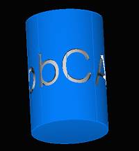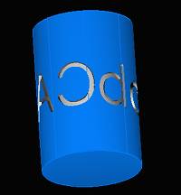 The following image shows the result of the 4-axis wrapping tutorial after backplotting the result. The image shows that the text is cut backwards or mirrored from the expected result.