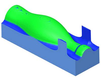 The following picture shows a machining of a bottle. The colorization is from green (min. material left) to blue (max. material left). You see two significant results: