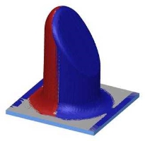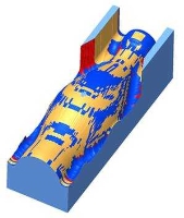 The following picture shows a machining of a male formed part. The colorization is red (for plunging) and blue (for retracting). The machining is OneWay, starting from one side going to the other side.