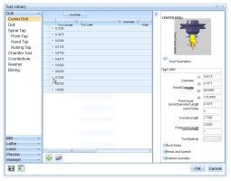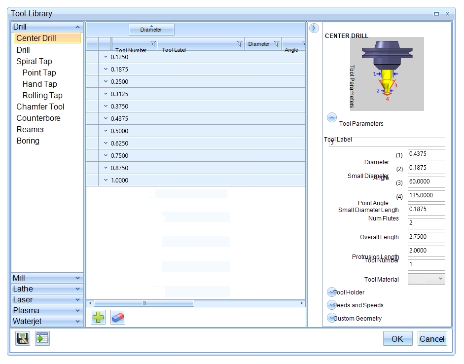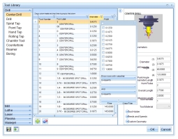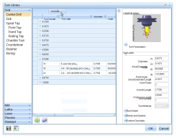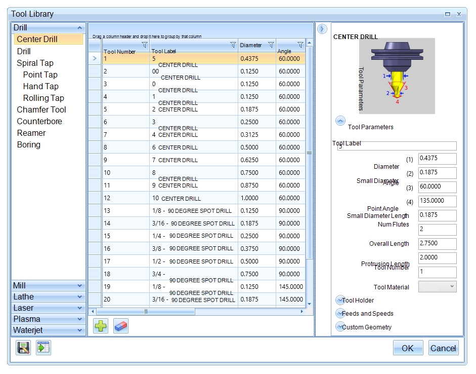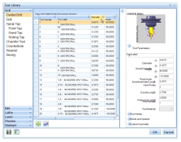 The Tool Library contains all of the available system tools based on the main categories Drill, Mill, Lathe, Laser, Plasma, and Waterjet. This dialog box is used to add, delete, and modify tools. You can also load tool information from a previously saved file. On the left side of the dialog box is a list of the supported tool types. The right side contains the tool parameters list for each tool.