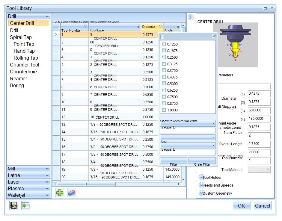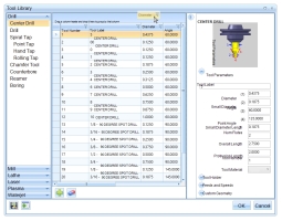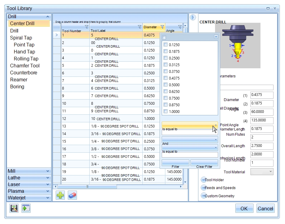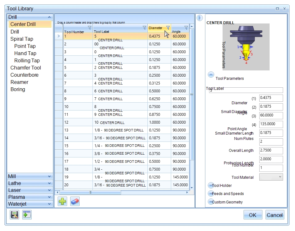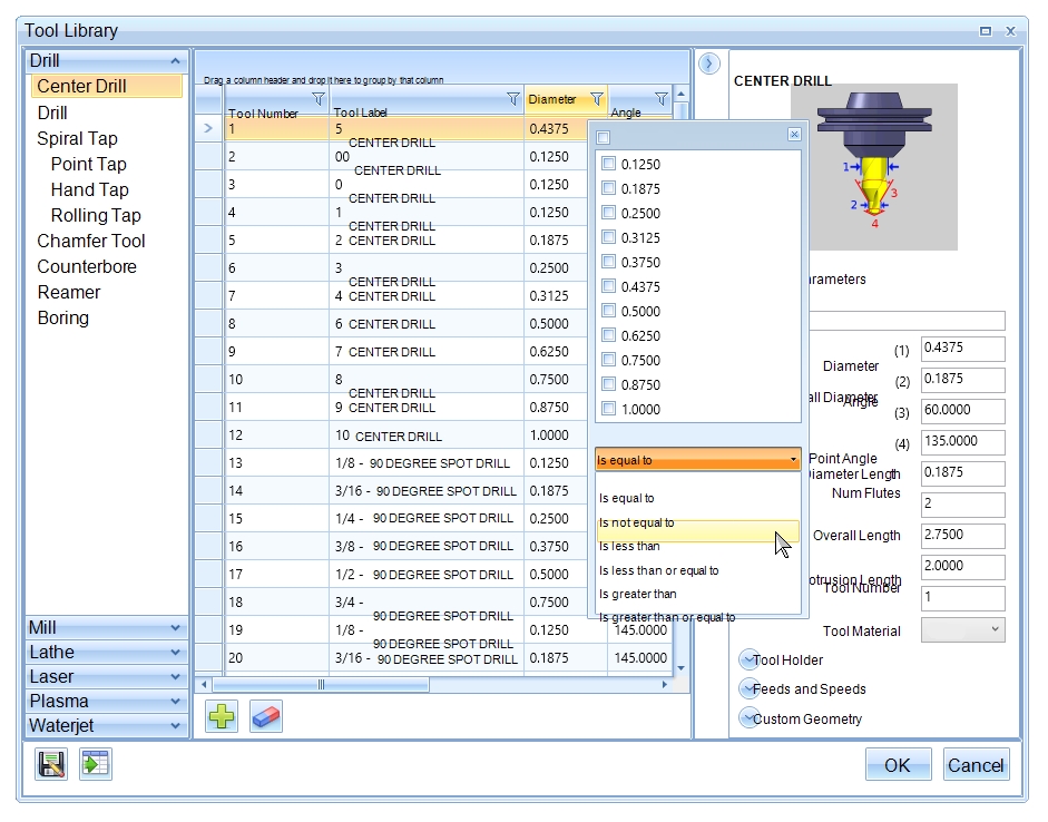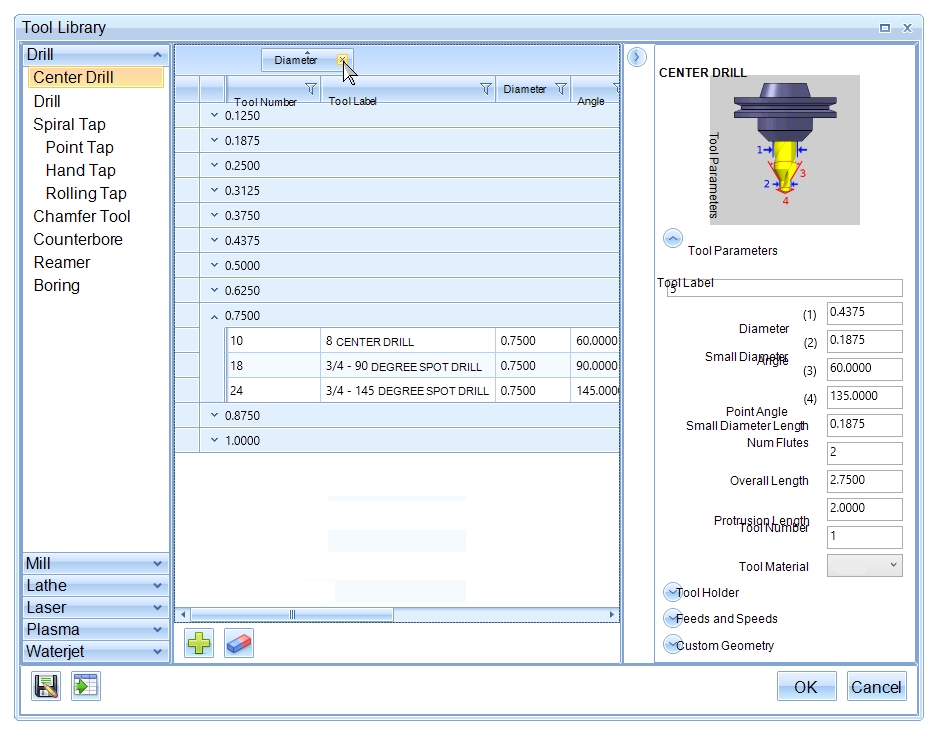 Tip: For this example, use the Diameter column of the Center Drill. Before beginning, sort the Diameter group from largest to smallest by clicking on the Diameter header.
