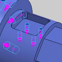 We can see that the drilling direction is correct for all holes. The software uses the center of the selected geometry to set the drilling direction, which for this part works perfectly. You may sometime need to reverse the direction when it is incorrect or when using other geometry types. To reverse the direction of one or more holes, select them in the Holes list (the direction indicator of the selected holes changes color in the graphics area), and click