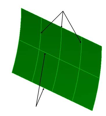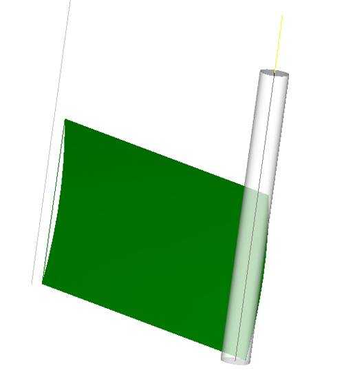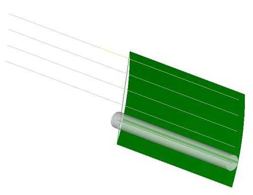 In this example there is a curved surface with a radius of 147.727 mm (this example is distended because usually the radii are smaller, but it is a good example to show how the function works). The toolpath is a single segment parallel to the lower edge with a tool axis tilted 90 degrees to the side. In the vertical direction the isometric lines of the surface are not ruled, instead, the horizontal isometric direction is ruled.