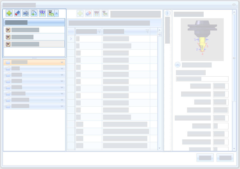 From this dialog you can view, add, delete, and copy libraries and their tools, and edit existing tools in the Tool Parameters dialog on the right, add and delete tools.