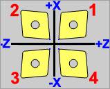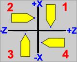 • Orientation Number - 1-4 sets the orientation of the tool as shown in the image. This selection influences the ability of the tool to move into locations that are restricted by adjacent geometry. The options available depend on the operation type.