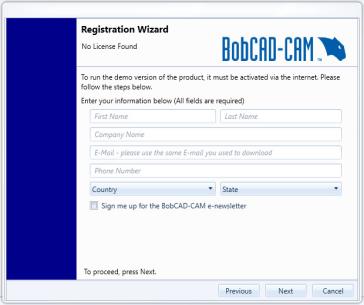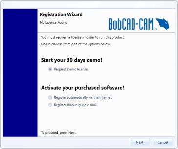 To run the software in Demo Mode, use the registration wizard to register the software as a 30 day demo. This is accomplished by turning on the BobCAM for SolidWorks add-in and then using the registration wizard to, first, request a demo license, and then to open the attachment that you receive in reply. An active Internet connection is required on the computer that is being registered. Follow the steps in this topic to register your software.