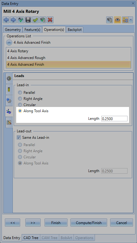 And for those working in 4-axis, the Advanced Finish operation just got a big boost with a new "Along Tool Axis" lead-in/out option. This gives you more control over how your tool enters and exits locking the tool orientation to the rotary axis, especially in complex geometries — reducing marks and improving part quality.