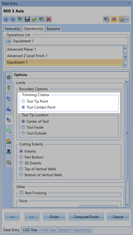 For Mill 3-Axis, Setting up Boundary constraints for the Operations just got a lot easier! The all-new "Boundary Options - Trimming Criteria" gives you a smarter, more accurate way to define machining areas. With the options of "Tool Tip Point" (Old Method) or "Tool Contact Point", you are able to easily cut along 3D surfaces in any X, Y, or Z direction. Instead of manually calculating and adjusting the boundary to where the tool hits, just let the system calculate it for you. The result? Your toolpath follows the actual contact point of the tool rather than over or under traveling, making setup faster and avoiding edge violations.