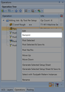 Backplot - This page allows you to simulate the motion of the tool while still inside the CAM Wizard to give you a good idea what the toolpath will look like. Just pick the Operation you want to view and hit the Play button. Note: For more detailed simulation, click "Start SImulation" in the Milling/Turning/Wire EDM/Mill Turn tab at the top ribbon to load our full simulation.