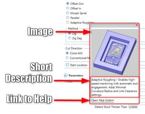 Now, as you build your toolpaths, just hover your mouse over any parameter in the CAM Wizard. Instantly, you’ll get a helpful pop-up with: