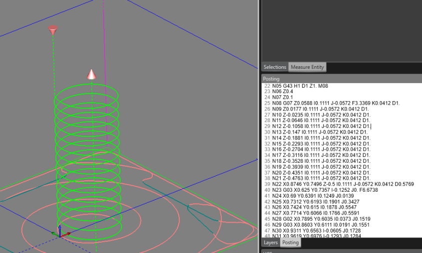 In the previous version of BobCAD-CAM, we added new Post Blocks to handle Helix Moves. In the new version, we have added further support for helix moves with the new post variable, helix_num_revolutions, which sets the number of revolutions in the helix move line in the g-code. We also added Post Questions: 735, 736, and 737. 735 handles the prefix for the new helix_num_revolutions post variable. 736 sets the Helix that moves in the clockwise direction. 737 sets the Helix that moves in the counter-clockwise direction. Both 736 and 737 are called from the g_arc_move post variable. Make sure this post variable is in the Helix Blocks (67, 68, 69) if you need this type of output. If the helix segment were to make 1 complete 360 degree revolution and the prefix on 735 is set to "D", the output code would be D1.