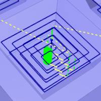 The following is an example toolpath with two depth steps and the spiral ramping option turned on with no plunge location assigned. Notice the spiral ramp move is applied to all depths from the top to the bottom of the feature.