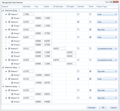The machining features are automatically created based on a customizable set of rules in our new knowledge base, and all can be computed at once!